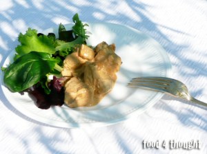 La scelta è stata inevitabile: il Coronation Chicken, un  insalata di pollo inventata appositamente per il banchetto dell’incoronazione di Elizabeth II (AKA, affettuosamente, Queen Lizzie!), quindi quasi 60 anni fa. Con il tempo è diventato in Inghilterra popolarissimo – raramente manca ad una festa – e ognuno credo abbia la sua versione. Spesso è  purtroppo banalizzato in un mucchietto di pollo condito con una maionese a cui si è aggiunto un po’ di curry premiscelato e proveniente direttamente dagli scaffali del supermercato – ma si sa, su queste cose sono una vera snob, LOL! –  la mia versione, per quanto personalizzata, parte perciò da una base un po’ più vicina all’originale.