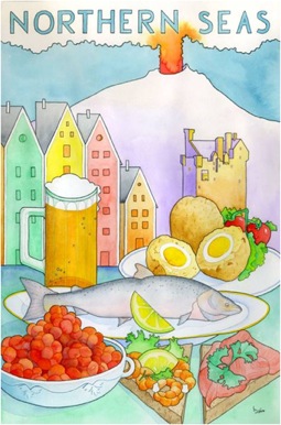I cibi e i prodotti tipici dei paesi che si affacciano sui mari del nord Europa sono il soggetto di questo acquarello realizzato da Roberto Bixio per Costa Crociere.   Ho voluto partecipare al gioco proposto da Antonella di ‘Il luppolo Selvatico’ e andare a ritroso: farmi ispirare dall’immagine per identificare un piatto che la rappresenti. Non potevo scegliere altro che questo: