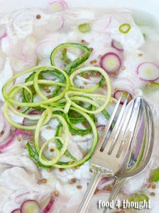 Tutto questo per dire che forse sono un po’ maniacale ma anche che lo stupido tempera carote è l’artefice della decorazione di riccioli di zucchine che vedete in questo piatto. Per cui, stupido ma simpatico, direi.