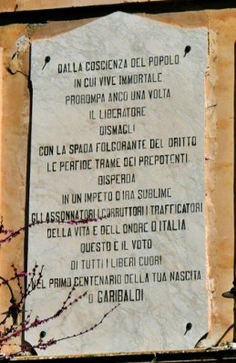 Dimenticavo di dire: in Sicilia e nella fattispecie a Modica. mi sono imbattuta in una lapide dedicata ad un personaggio che in qualche modo ulteriormente unisce l’isola alla mia regione: Garibaldi. Il testo mi ha fulminata, tanto che, io che detesto sottoporre amici e parenti alla sciorinatura delle mie foto delle vacanze, ve la voglio proporre qui, unica testimonianza del mio viaggio. Ditemi voi se quanto scritto cent’anni fa non mantiene oggi un’attualità dolorosa e non riflette, nelle sue speranze, quello spirito che io voglio leggere come il vero spirito della parte migliore di questo paese.