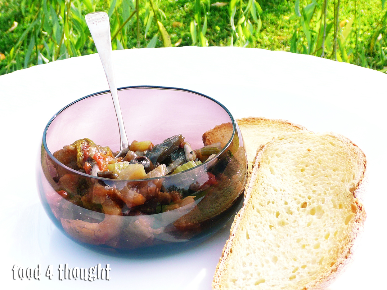 Però è così, è la verità. Io la caponata l’ho imparata da Jane Grigson, e scusate se è poco: la Papessa del cibo ci ha lasciato ormai da più di vent’anni ma ha avuto tutto il tempo per riportare una nazione intera sulla retta via culinaria. I suoi libri sono a tutt’oggi preziosissimi. E pensare che si tratta di quei libri di cucina di una volta, senza una foto che sia una, dove tutto è lasciato alla maestria di chi scrive nel raccontarti origini, aneddoti storici e culinari e, soprattutto, ricette che ti fanno sognare! E che non sia mai stata tradotta in Italiano è a dir poco un peccato (avessi a questo punto risvegliato qualche curiosità guardate per esempio  QUI).