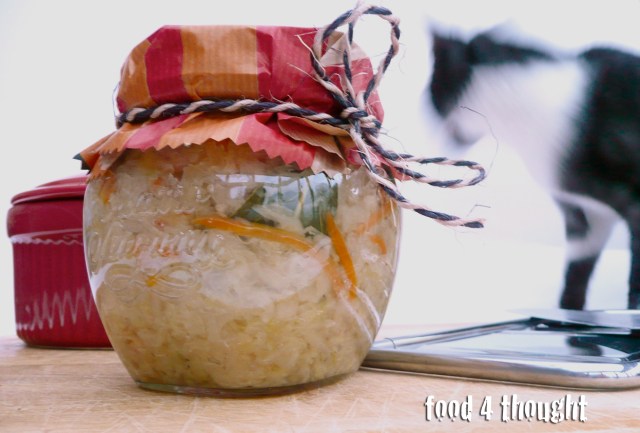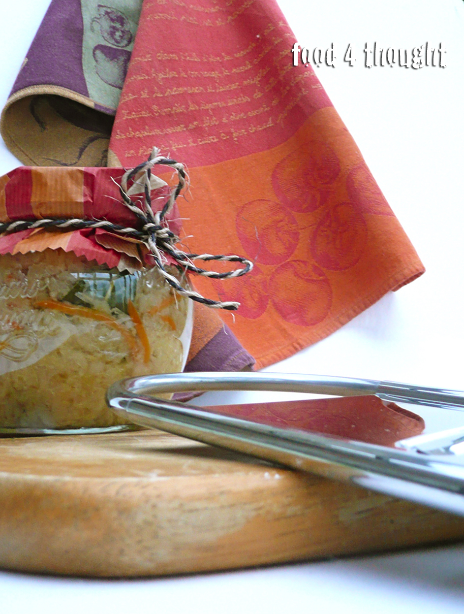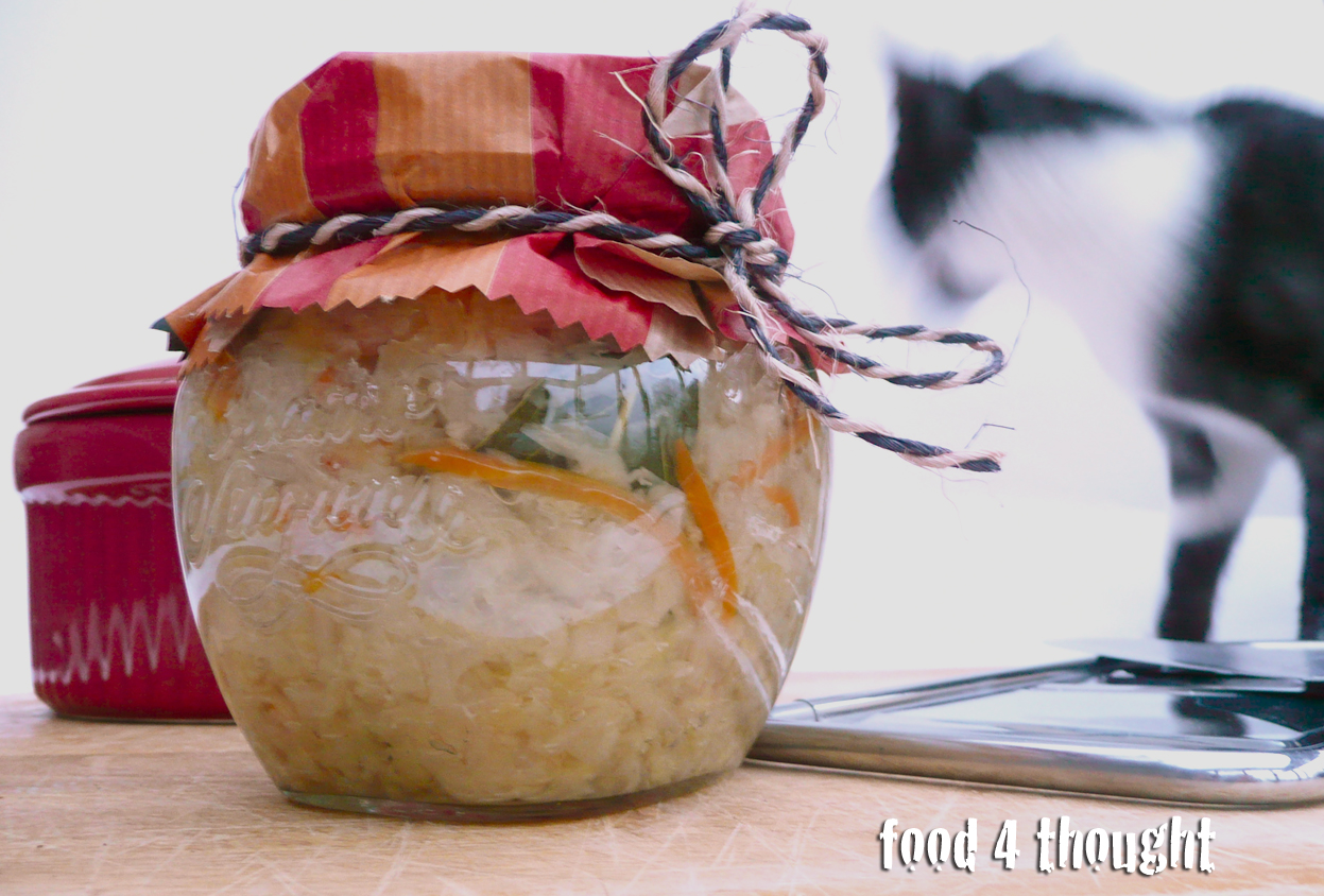 - Questo dipende però anche dalle condizioni climatiche. Per esempio, avendo preparato i miei sauerkraut ad agosto, sapevo che anche in cantina io non avrei avuto una temperatura così bassa per alcuni mesi. Per evitare un’eccessiva fermentazione che avrebbe trasformato troppo in fretta i miei sauerkraut in una pappetta molliccia ho scelto di bloccare il processo invasando nel contempo i sauerkraut in vasetti che ho poi sigillato. Per fare questo ho semplicemente scolato i sauerkraut e li ho invasati. Ho quindi portato la salamoia ad ebollizione e l’ho fatta bollire per 5 minuti versandola quindi ancora calda nei vasetti. Ho premuto bene con un cucchiaio di legno per fare uscire tutte le bolle d’aria, ho chiuso e capovolto i vasetti per creare il sottovuoto. Li ho quindi riposti in dispensa, pronti da consumare. Come ve lo racconterò a breve …