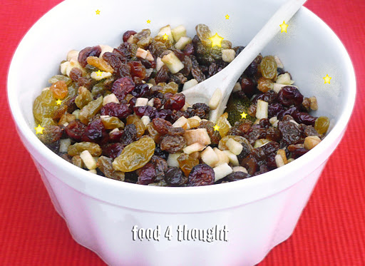 • unite la frutta (uva sultanina, uva passa gigante, mirtilli rossideidratati, ciliegie candite, scorza d’arancia candita e la mela), il succo dilimone e il cognac in una ciotola. Mischiate bene, coprite e lasciate riposarela notte.