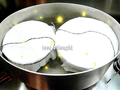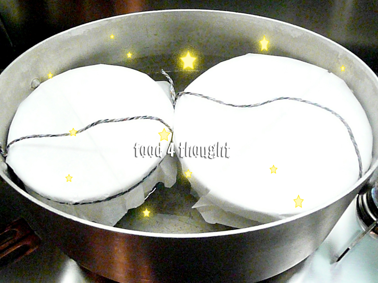 • Preparate per ogni forma un disco di cartaforno e uno di alluminio, entrambi con una piega al centro per consentirel’espansione del pudding, che abbiano la dimensione necessaria a posarsiall’interno della forma a contatto con la superficie dell’impasto. Coprite conun terzo disco di carta forno più grande che si spinga oltre il bordo e possaessere saldamente legato con uno spago.