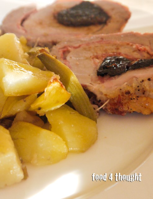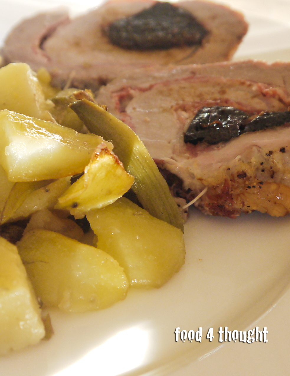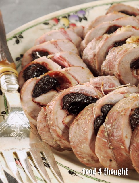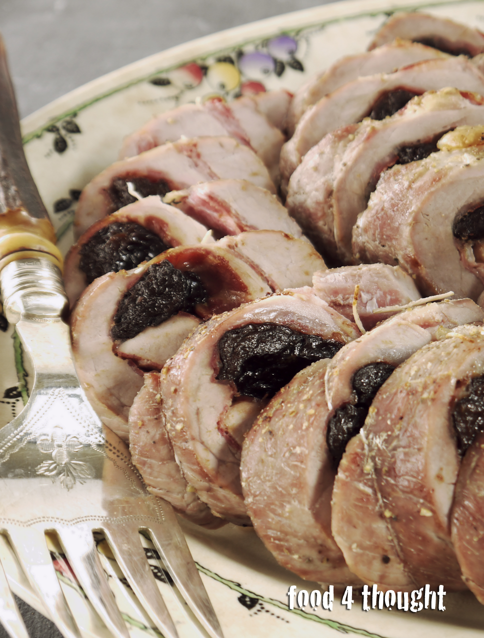 Questa versione del filetto di maiale alle prugne, dove le prugne insieme alla pancetta affumicata ne sono il cuore tenero e succoso, è un piatto di cui reclamo la paternità e che mi sono inventata qualche anno fa. Il metodo di cottura, al forno senza aggiunta di condimenti ne fa un’ arrosto classico mentre il ripieno aggiunge un tocco di interesse e di sorpresa. Molti di voi ricorderanno probabilmente come l’accoppiata pancetta affumicata (o, volendo fare i precisini, bacon) / prugne sia santificata da un’altra preparazione conosciutissima, quello dei Devils on Horseback, uno dei fingerfood più conosciuti da sempre. Direi infatti fin da tempi non sospetti, ancor prima che il tanto inflazionato termine fingerfood venisse coniato. L’idea perciò è stata semplicissima, per l’appunto quella di unire due classici. A mio avviso però, e anche secondo i miei commensali visto l’abituale successo che questo piatto riscuote, questo è il tipico caso in cui uno più uno non fa due ma almeno tre o quattro;)))))))