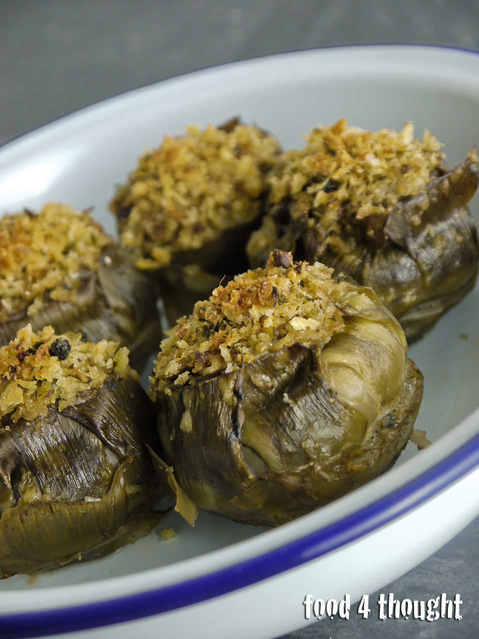 Confesso, qualche piccola variazione l’ho fatta. Ma il risultato è stato entusiasmante e chiedo qui perdono a Ale e a tutte le altre brave blogger Siciliane se così facendo ho stravolto un po’ la ricetta tradizionale. La variante principale che ho inserito è stato il tipo di formaggio: qui da me il caciocavallo siciliano è più o meno introvabile. Avrei potuto usare del caciocavallo silano ma a dispetto del nome a me pare piuttosto diverso. Così ho optato invece per la coerenza geografica e ho utilizzato – tenetevi forte – del Piacentinu Ennese DOP! Si, lo so, è tutta un’altra cosa. Si tratta in questo caso di un formaggio pecorino, e per di più con l’aggiunta di zafferano e grani di pepe ma tant’è, l’idea mi ispirava e a cose fatte non mi sono affatto pentita di questa trasgressione. L’altra piccola variazione è stata alla fine quando, a cottura ultimata, non ho resistito a dargli una piccola botta di grill, dopo avere aggiunto sulla sommità di ciascun carciofo una spolverata del ripieno che avevo avanzato. Di nuovo, non so a quali regole della tradizione posso aver trasgredito, ma la crosticina croccante che si è formata in cima ha reso a mio avviso il tutto ancora più appetitoso.