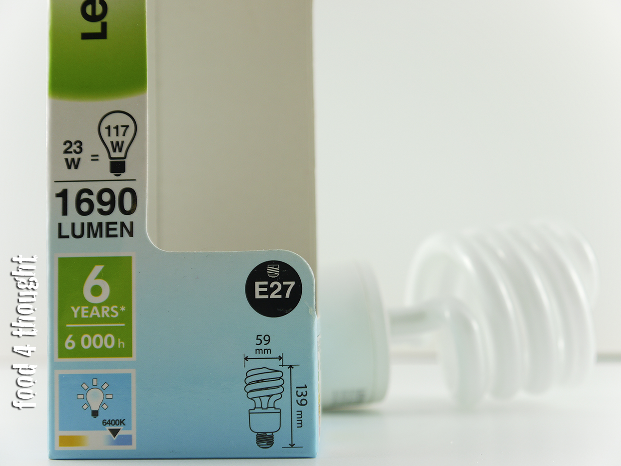 Le lampadine sono di quelle a basso consumo con forma che chiamerò a tortiglione (o fusillo se preferite, LOL!) da 23W, o 117W equivalenti.