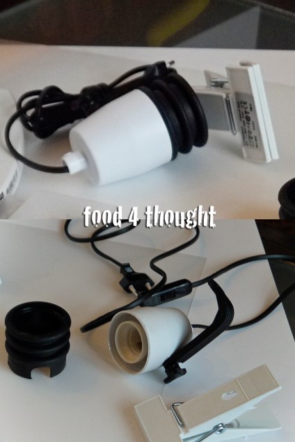 Questa è stata una mia idea e ne sono piuttosto orgogliosa: una genialata! Ho trovato e comprato 4 faretti a pinza dei più economici, tutti in plastica (foto sopra). Arrivata a casa li ho smontati, eliminando la pinza e tenendo solo il braccetto snodabile (foto sotto) che risultava perfetto come supporto con cui fissarli alla struttura della lampada.