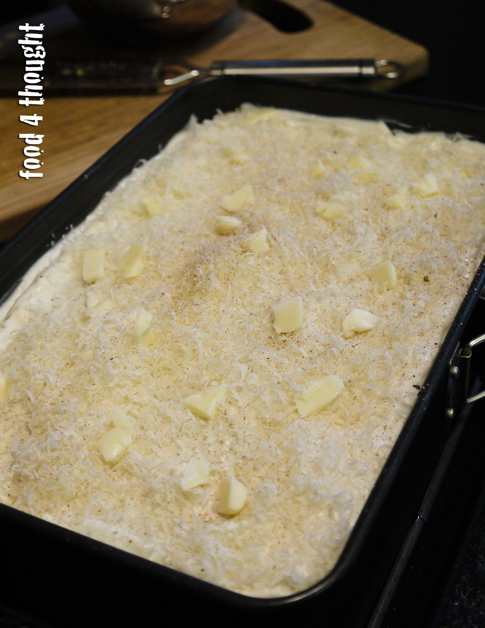 - Cospargete con alcuni fiocchetti di burro e una spolverata di noce moscata. Infornate a forno preriscaldato a 180° per circa venti minuti o sino a quando in superficie non si sia formata una crosticina dorata (volendo dategli a questo scopo un colpo di grill).
