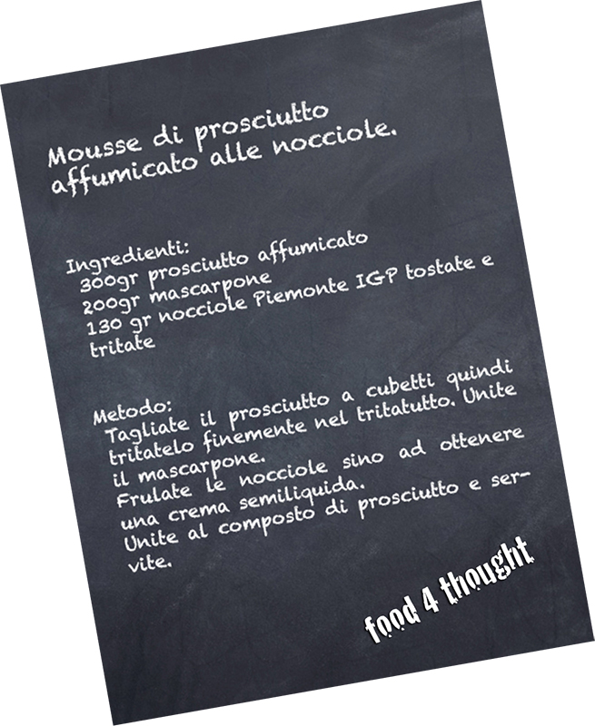 Tanto che pochi giorni dopo essere tornata a casa, in occasione di un pranzo a cui avevo invitato due care amiche blogger, Laura di Pentole di Cristallo e Carla di Napoli Centrale-Torino Porta Nuova, mi è venuto spontaneo fargli un piccolo omaggio con la Mousse di Prosciutto di cui vi allego la (semplicissima) ricetta. L’incontro tra la crema di nocciole tostate – ovviamente Nocciole Piemonte IGP, ca va sans dire – e il prosciutto affumicato è stato perfetto ed ha arricchito una preparazione semplice e ‘normale’ trasformandola in un piatto di riproporre con sicurezza. Aggiungo che in questa occasione il prosciutto affumicato era l’avanzo di uno ‘smoked gammon’ importato direttamente dall’Inghilterra e da me cotto qualche giorno prima: un’occasione perfetta per unire le mie due anime di anglo-monferrina. Ma in mancanza di quello qualsiasi prosciutto cotto affumicato va ugualmente bene.