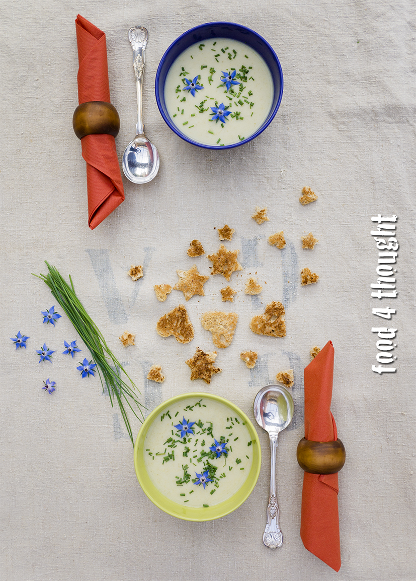 • Serve cold with a sprinkle of chives finely chopped with a pair of scissors and garnish with a few borage flowers from the garden.