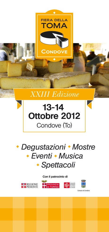 Così domenica prossima, 14 Ottobre, approfitterò dell’occasione della Fiera della Toma che si terrà a Condove in Val di Susa per riaffacciarmi al mondo semi-pubblico dei fornelli in rete. Sarò infatti una di sei blogger che si sono prestate all’iniziativa Una Ricetta all’Ora che si terrà all’interno di questa manifestazione. Ognuna di noi preparerà una ricetta semplice e veloce che avrà come protagonista principale la Toma della valle.